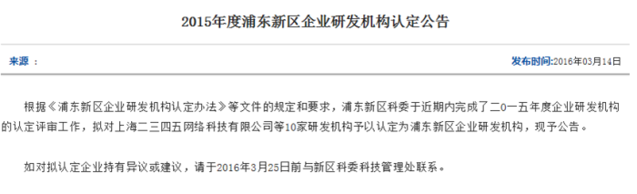 3月14日,上海市浦東新區(qū)科學(xué)技術(shù)委員會(huì)正式公示“2015年度企業(yè)研發(fā)機(jī)構(gòu)”認(rèn)定名單,上海二三四五網(wǎng)絡(luò)科技有限公司(簡(jiǎn)稱(chēng)“2345.com”)等10家研發(fā)機(jī)構(gòu)榜上有名。