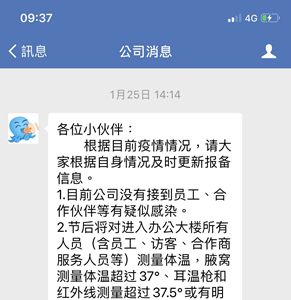 1月21號應(yīng)急小組成立后,立即統(tǒng)計湖北籍員工,采取一對一溝通,強(qiáng)烈建議他們暫停返鄉(xiāng)。