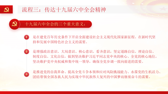 會議流程三,向各位黨員傳達黨的十九屆六中全會精神,強調(diào)十九屆六中全會召開的重大意義。號召各位黨員貫徹并落實“兩個維護”的重要內(nèi)容,即“堅決維護習近平同志黨中央的核心、全黨的核心地位,堅決維護黨中央權(quán)威和集中統(tǒng)一領(lǐng)導”。